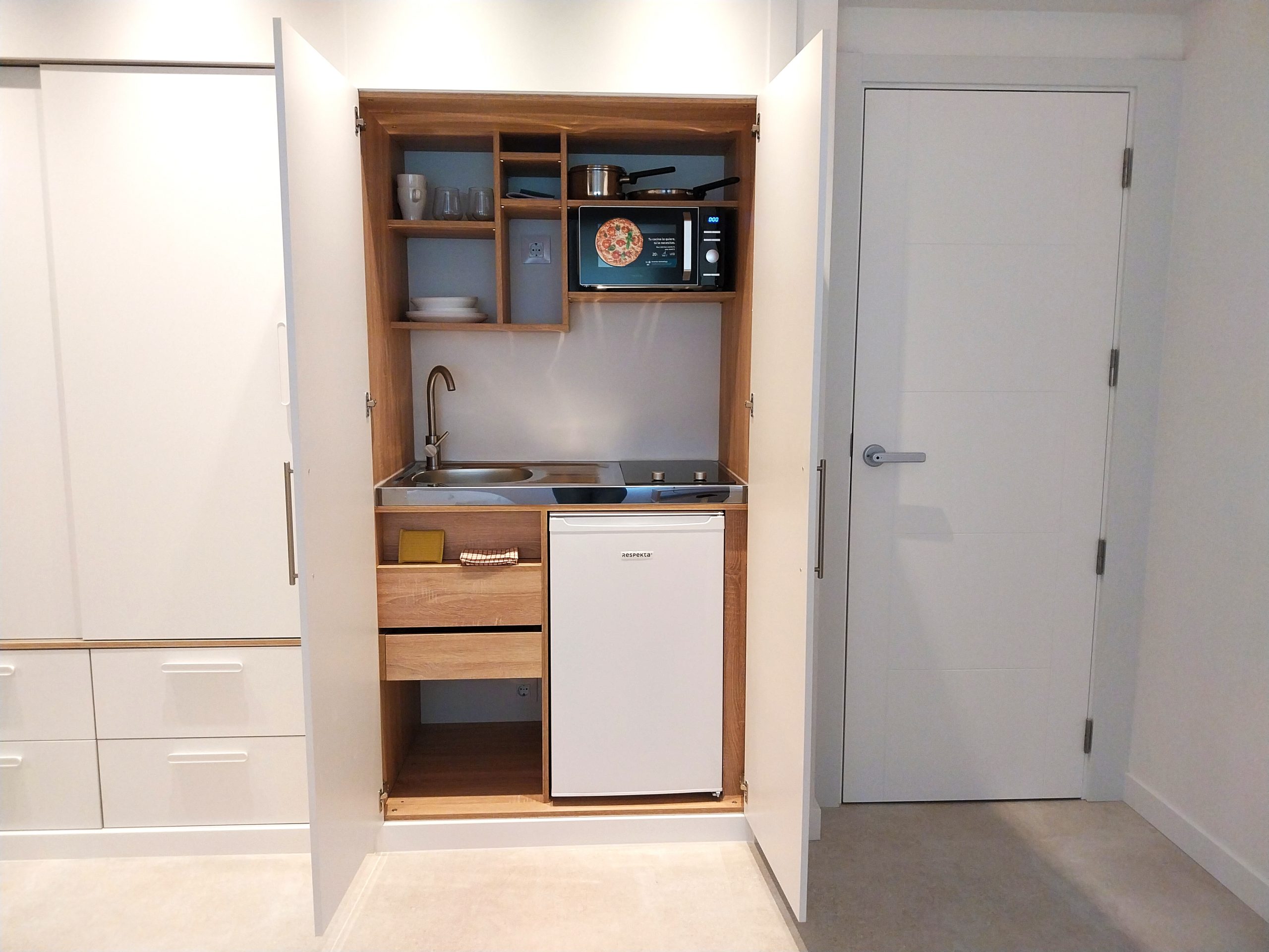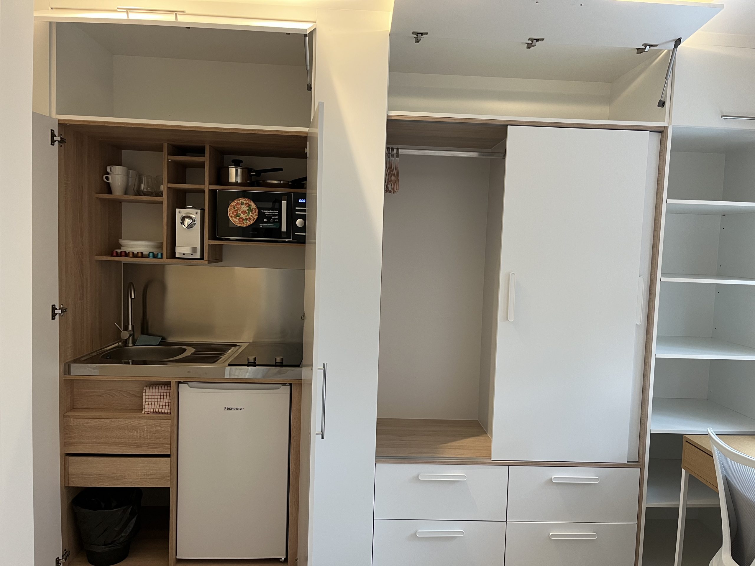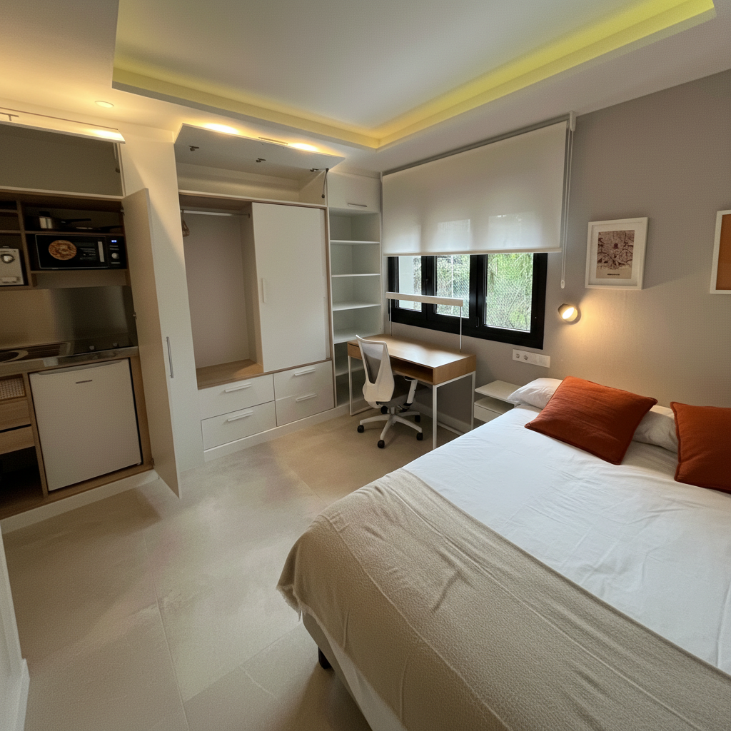 Nuestros estudios, de entre 19 y 29m², están diseñados para que te sientas como en casa desde el primer día. Cada espacio cuenta con baño privado, office totalmente equipado, cama de alta gama, escritorio con silla ergonómica y amplios armarios revestidos que aportan orden y funcionalidad.